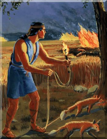 Dopo qualche tempo, nei giorni della mietitura del grano, Sansone andò a visitare sua moglie, le portò un capretto e disse: "Voglio entrare da mia moglie nella camera". Ma il padre di lei non gli permise di entrare e gli disse: "Credevo proprio che tu l'avessi ripudiata e perciò l'ho data al tuo compagno; la sua sorella minore non è più bella di lei? Prendila dunque al suo posto". Ma Sansone rispose loro: "Questa volta non sarò colpevole verso i Filistei, se farò loro del male". Sansone se ne andò e catturò trecento volpi; prese delle fiaccole, legò coda e coda e mise una fiaccola fra le due code. Poi accese le fiaccole, lasciò andare le volpi per i campi di grano dei Filistei e bruciò i covoni ammassati, il grano tuttora in piedi e perfino le vigne e gli oliveti. I Filistei chiesero: "Chi ha fatto questo?". Fu risposto: "Sansone, il genero dell'uomo di Timna, perché costui gli ha ripreso la moglie e l'ha data al compagno di lui". I Filistei salirono e bruciarono tra le fiamme lei e suo padre. Sansone disse loro: "Poiché agite in questo modo, io non la smetterò finché non mi sia vendicato di voi".